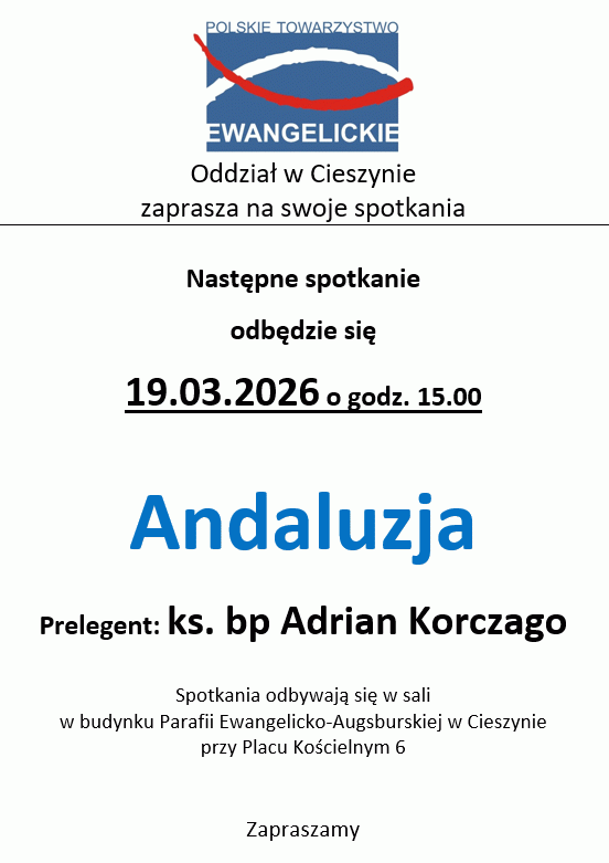 Spotkanie odbędzie się w czwartek 19 marca 2026 r. o godz. 15 w sali w budynku Parafii Ewangelicko-Augsburskiej w Cieszynie przy placu Kościelnym 6.