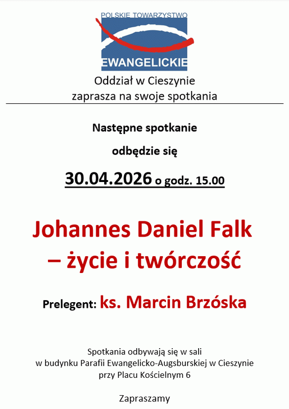 Oddział Polskiego Towarzystwa Ewangelickiego w Cieszynie zaprasza wszystkich zainteresowanych na spotkanie „Johannes Daniel Falk – życie i twórczość”. Prelekcję przedstawi ks. Marcin Brzóska.