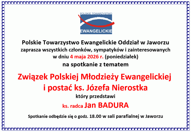 Oddział Polskiego Towarzystwa Ewangelickiego w Jaworzu zaprasza wszystkich zainteresowanych na prelekcję „Związek Polskiej Młodzieży Ewangelickiej i postać ks. Józefa Nierostka”, którą przedstawi ks. radca Jan Badura.