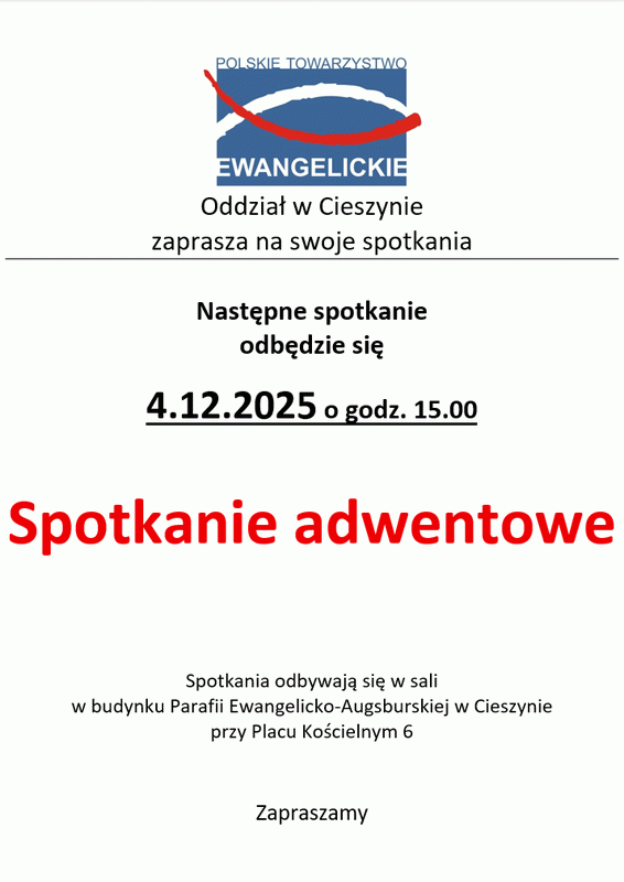 Oddział Polskiego Towarzystwa Ewangelickiego w Cieszynie zaprasza wszystkich na „Spotkanie adwentowe”.