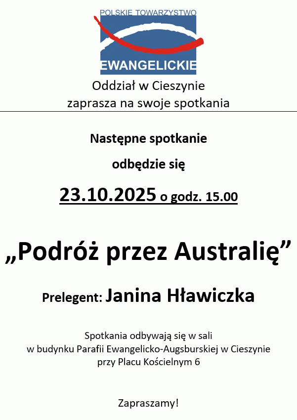 Oddział Polskiego Towarzystwa Ewangelickiego w Cieszynie zaprasza wszystkich na spotkanie „Podróż przez Australię”. Prelegentlą będzie Janina Hławiczka.