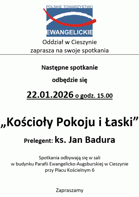 Oddział Polskiego Towarzystwa Ewangelickiego w Cieszynie zaprasza wszystkich na spotkanie „Kościoły Pokoju i Łaski”. Prelegentem będzie ks. Jan Badura.